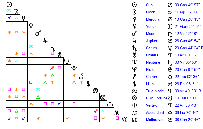 | Pluto | 20 Cancer 8 | 3 Aquarius 5 | 22 Cancer 5 |