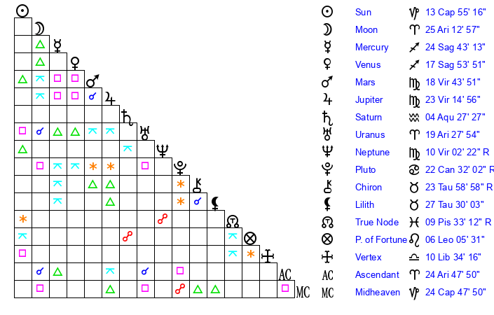 | Moon | 25 Aries 14 | 14 Pisces 47 | 26 Leo 21 |