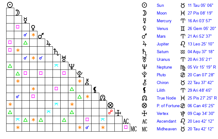 | Sun | 11 Taurus 5 | 11 Taurus 34 | 10 Leo 9 |