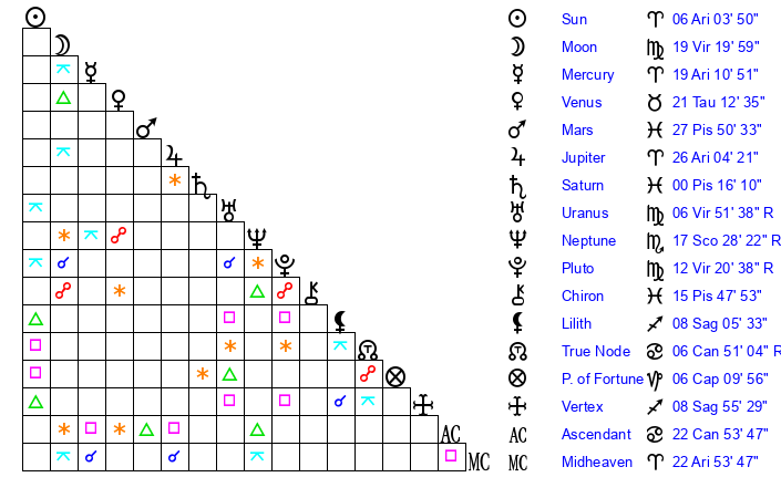 | Sun | 6 Aries 4 | 6 Aries 17 | 5 Gemini 27 |