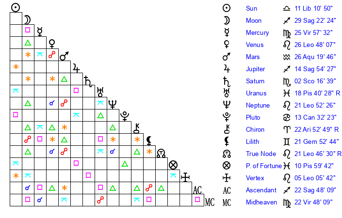 | Moon | 29 Sagittarius 16 | 8 Pisces 37 | 2 Virgo 37 |