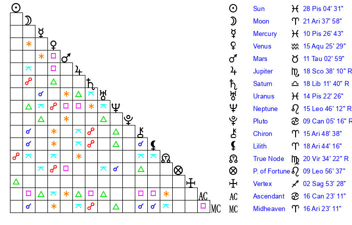 | Saturn | 18 Libra 53 | 22 Pisces 55 | 14 Libra 8 |