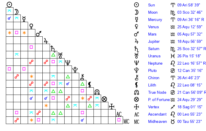 | Mercury | 9 Aries 36 | 29 Pisces 4 | 11 Leo 45 |