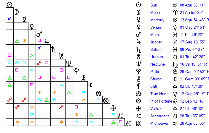 | Moon | 21 Aries 52 | 12 Aquarius 20 | 28 Cancer 26 |