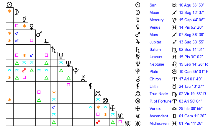 | Sun | 10 Aquarius 34 | 12 Aquarius 4 | 20 Taurus 42 |