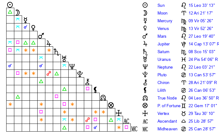 | Moon | 12 Aries 25 | 8 Aquarius 8 | 28 Scorpio 36 |