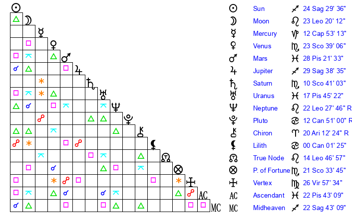 | Neptune | 22 Leo 27 | 29 Pisces 22 | 20 Leo 5 |