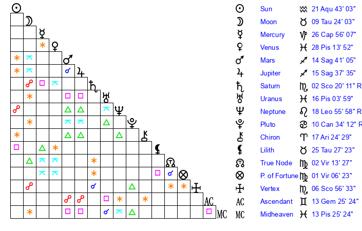 | Sun | 21 Aquarius 43 | 23 Aquarius 13 | 1 Gemini 18 |
