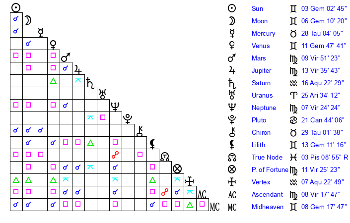 | Neptune | 7 Virgo 24 | 1 Aries 43 | 9 Virgo 35 |