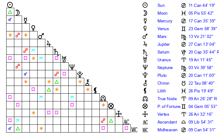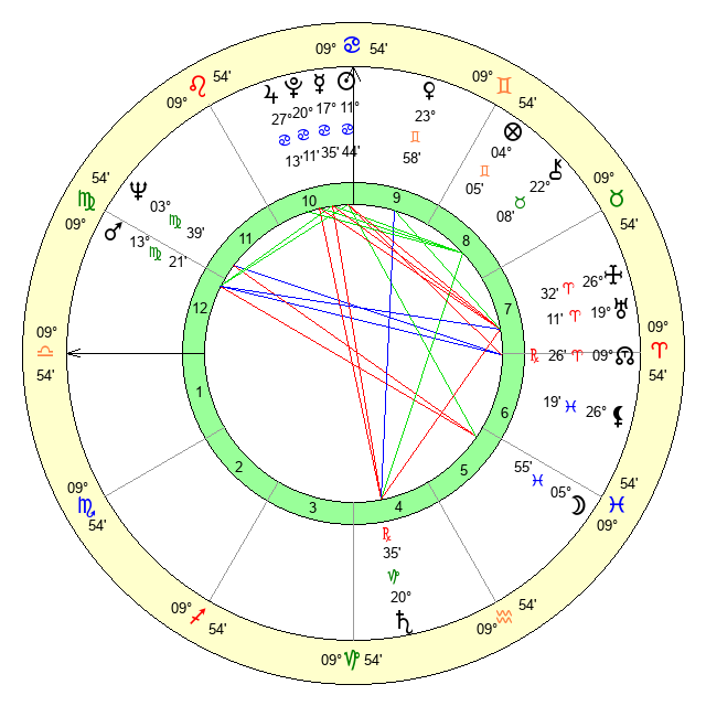 | Sun | 11 Cancer 44 | 12 Cancer 58 | 12 Libra 28 |