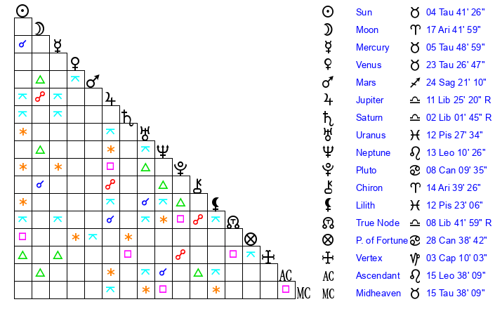 | Saturn | 2 Libra 45 | 27 Pisces 13 | 4 Libra 39 |