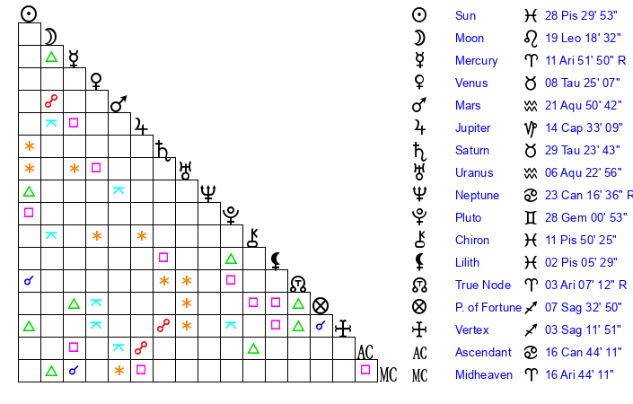 Sun | 28 Pisces 29 | 29 Pisces 20 | 16 Cancer 50 |