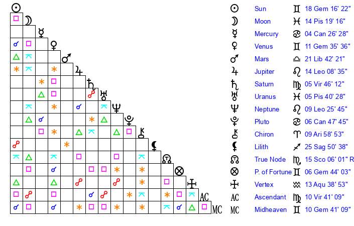 | Sun | 18 Gemini 16 | 18 Gemini 52 | 29 Virgo 7 |