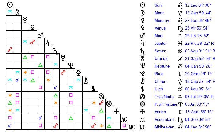 | Moon | 13 Capricorn 0 | 29 Sagittarius 56 | 25 Gemini 0 |