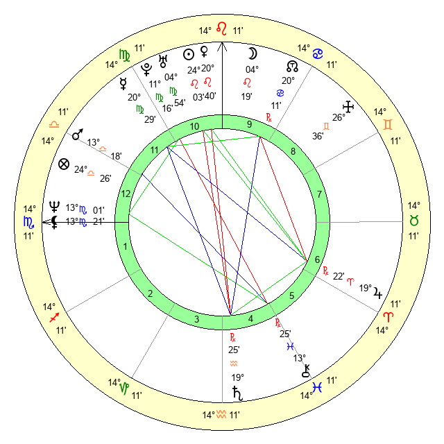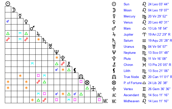 | Moon | 4 Leo 10 | 14 Gemini 37 | 7 Scorpio 32 |