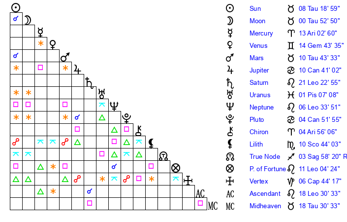 | Sun | 8 Taurus 19 | 9 Taurus 38 | 19 Leo 52 |