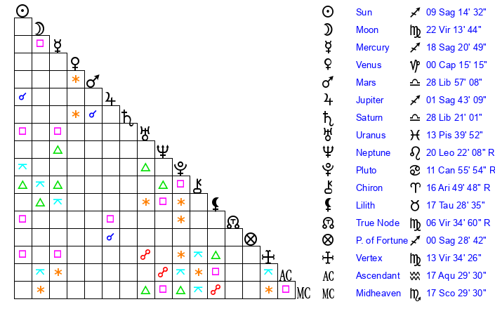 | Moon | 22 Virgo 16 | 4 Taurus 59 | 19 Gemini 51 |