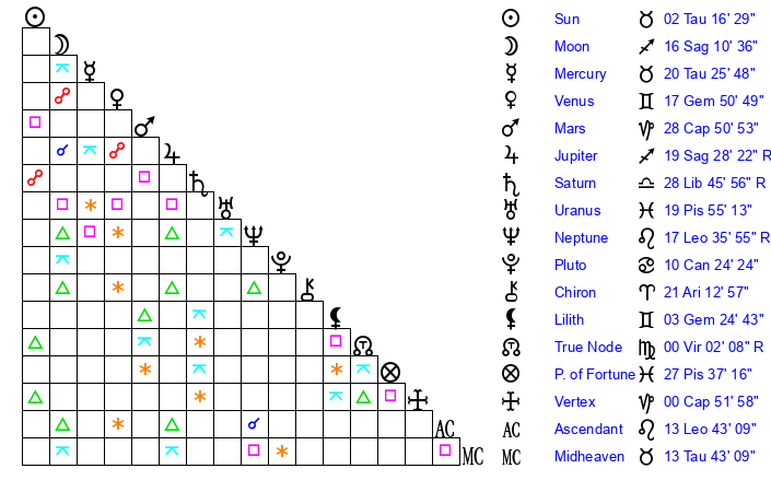 | Moon | 16 Sagittarius 6 | 22 Aquarius 59 | 19 Leo 32 |