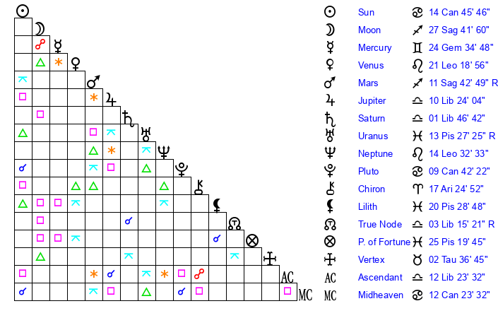 | Pluto | 9 Cancer 42 | 2 Aquarius 59 | 11 Cancer 12 |