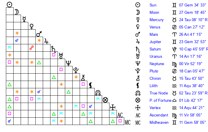 | Sun | 7 Gemini 35 | 8 Gemini 34 | 8 Virgo 31 |