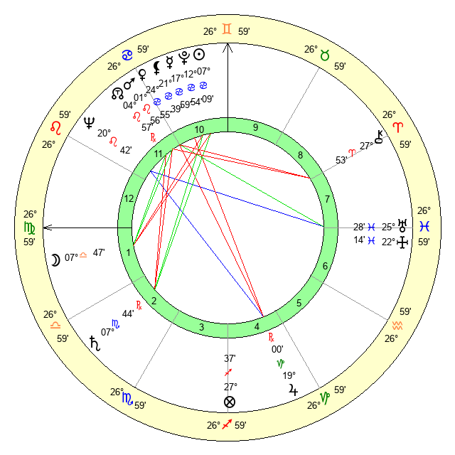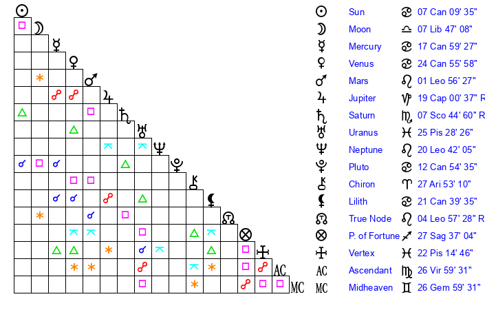 | Moon | 7 Libra 38 | 29 Leo 40 | 18 Gemini 9 |