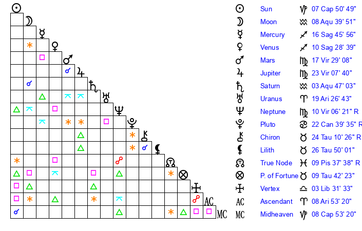 | Saturn | 3 Aquarius 59 | 14 Pisces 17 | 14 Aquarius 5 |
