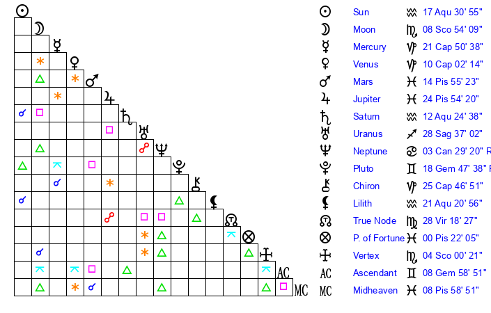 | Sun | 17 Aquarius 31 | 19 Aquarius 10 | 16 Gemini 28 |