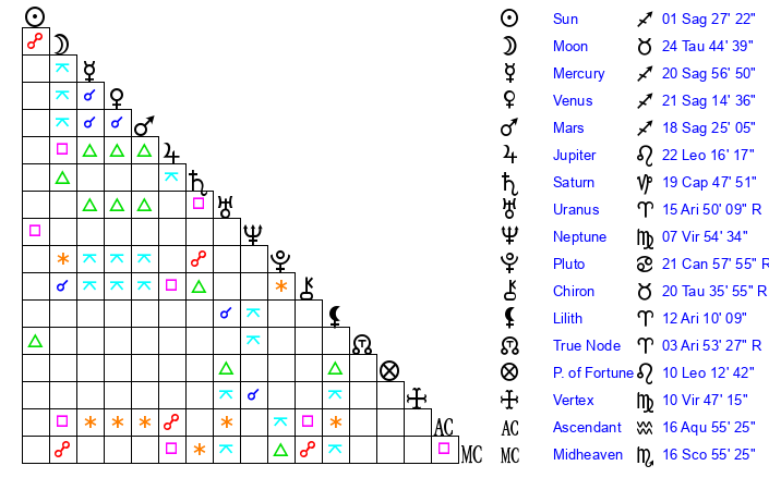 | Venus | 21 Sagittarius 15 | 22 Scorpio 17 | 16 Aries 42 |