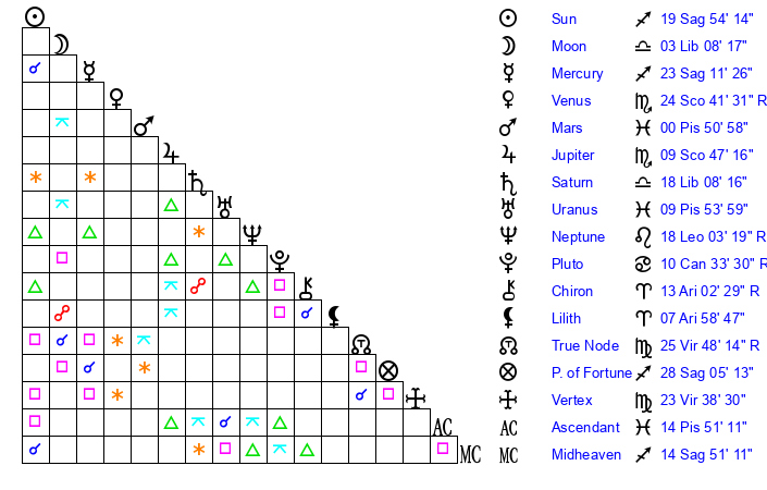 | Sun | 19 Sagittarius 54 | 20 Sagittarius 55 | 4 Aries 1 |