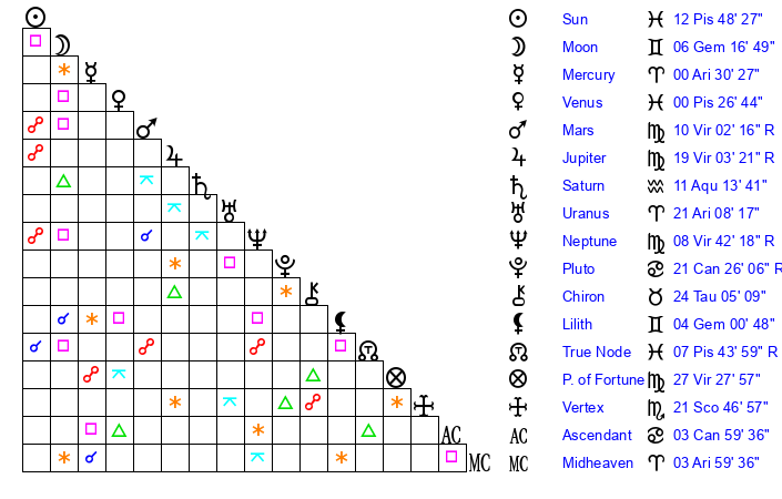 | Sun | 12 Pisces 48 | 13 Pisces 29 | 12 Gemini 45 |