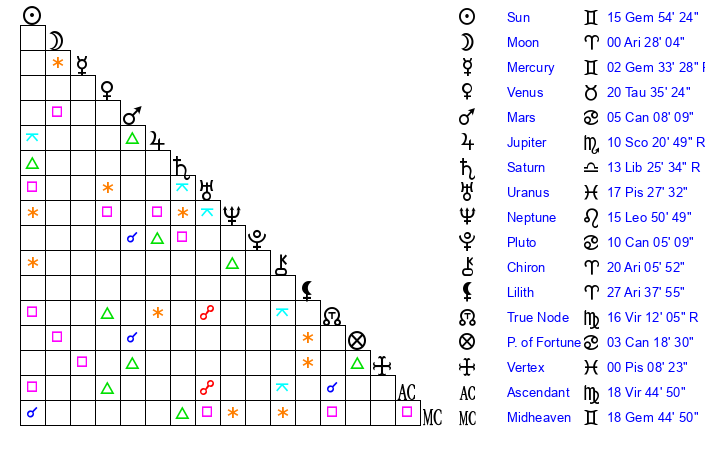| Sun | 15 Gemini 54 | 17 Gemini 12 | 23 Virgo 46 |