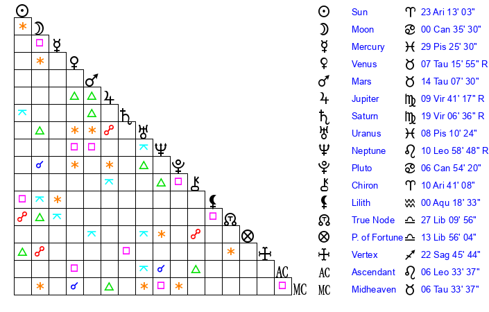 | Sun | 23 Aries 13 | 24 Aries 1 | 3 Leo 7 |