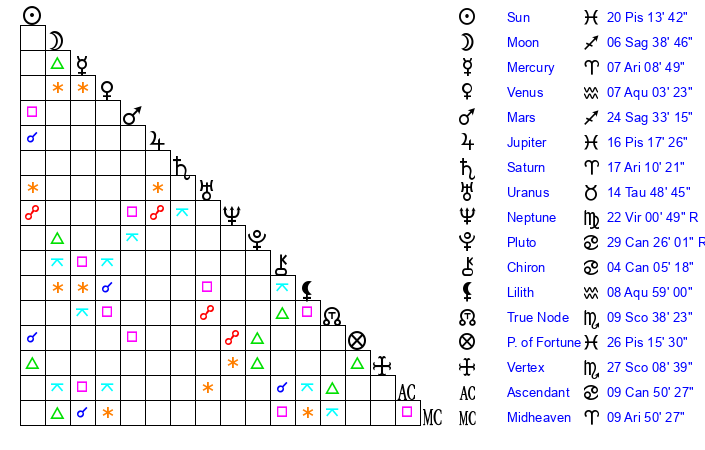 | Saturn | 17 Aries 17 | 21 Pisces 56 | 27 Aries 36 |