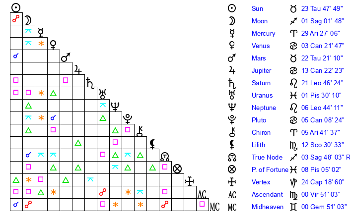 | Neptune | 6 Leo 44 | 1 Aries 30 | 10 Leo 2 |