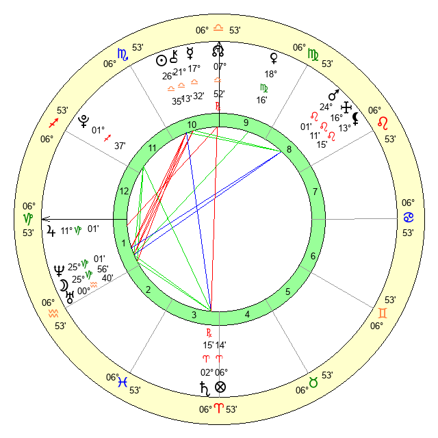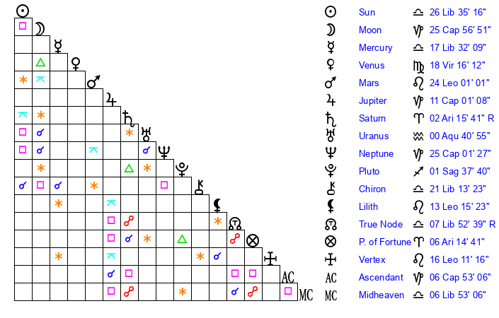 | Moon | 25 Capricorn 54 | 6 Libra 28 | 21 Aquarius 5 |