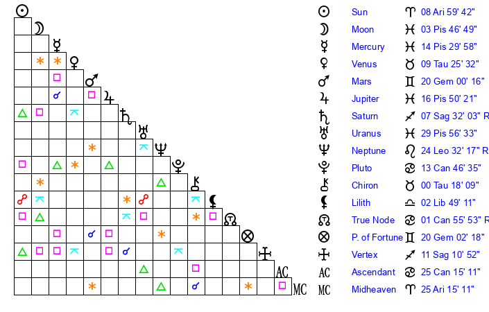 | Jupiter | 16 Pisces 48 | 15 Gemini 47 | 2 Aries 57 |