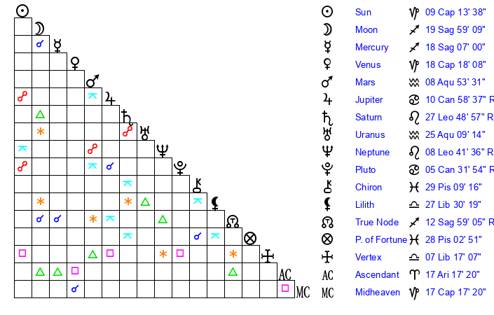 | Moon | 20 Sagittarius 2 | 19 Capricorn 58 | 10 Scorpio 20 |