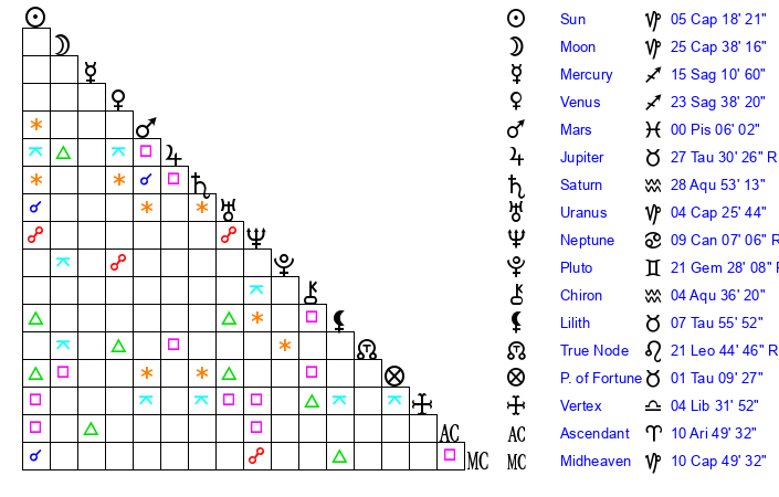 | Sun | 5 Capricorn 18 | 6 Capricorn 11 | 5 Taurus 32 |