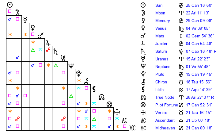 | Saturn | 7 Capricorn 38 | 1 Aries 47 | 6 Capricorn 56 |