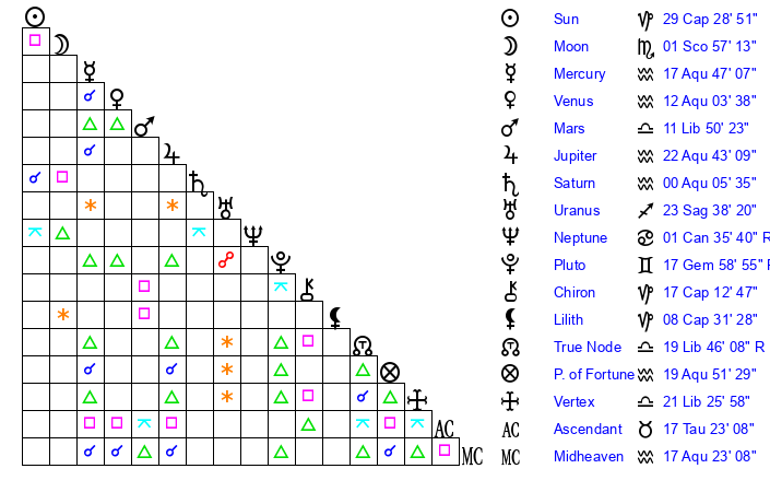 | Saturn | 0 Aquarius 32 | 16 Pisces 11 | 9 Aquarius 48 |