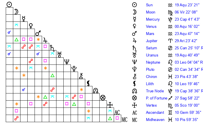 | Sun | 19 Aquarius 23 | 20 Aquarius 11 | 5 Gemini 48 |