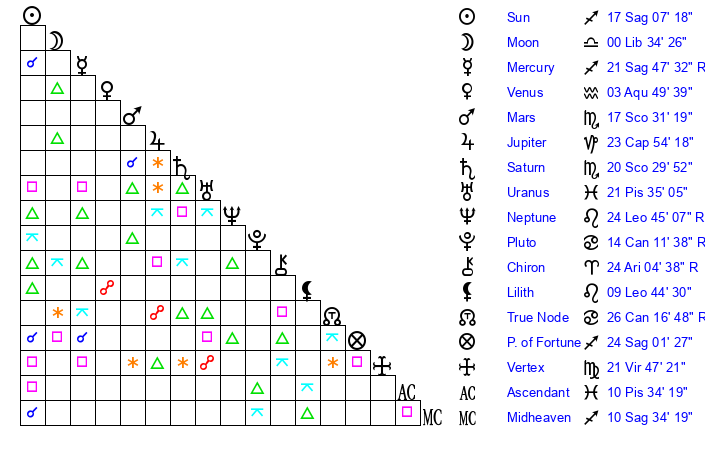 | Saturn | 20 Scorpio 58 | 25 Pisces 11 | 26 Scorpio 25 |