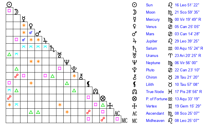 | Moon | 21 Scorpio 59 | 22 Aquarius 9 | 19 Aries 45 |