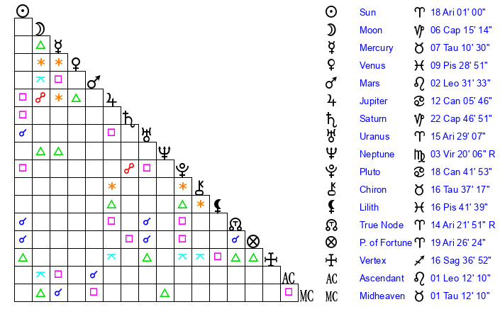 | Sun | 18 Aries 1 | 19 Aries 14 | 18 Cancer 32 |