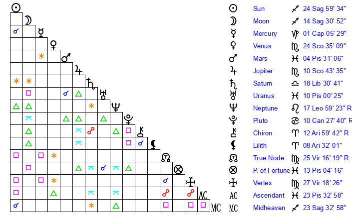 | Sun | 24 Sagittarius 59 | 26 Sagittarius 0 | 8 Aries 58 |