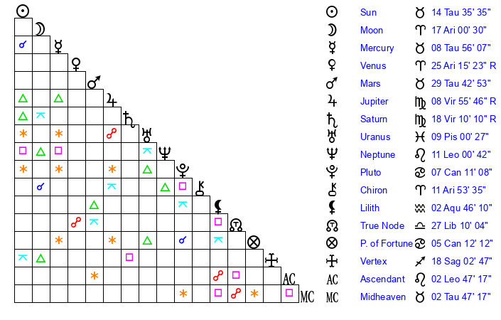 | Sun | 14 Taurus 36 | 15 Taurus 24 | 24 Leo 10 |