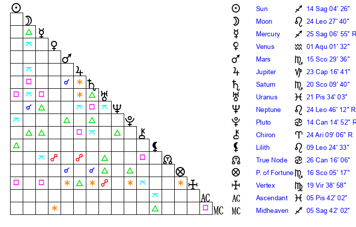 | Sun | 14 Sagittarius 5 | 14 Sagittarius 49 | 25 Pisces 21 |