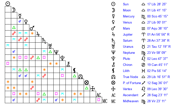 | Moon | 1 Libra 40 | 21 Gemini 40 | 28 Scorpio 10 |