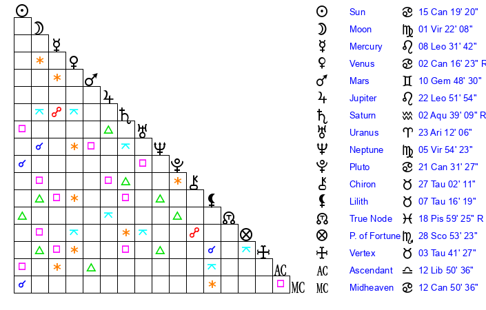 | Pluto | 21 Cancer 31 | 2 Aquarius 59 | 23 Cancer 24 |