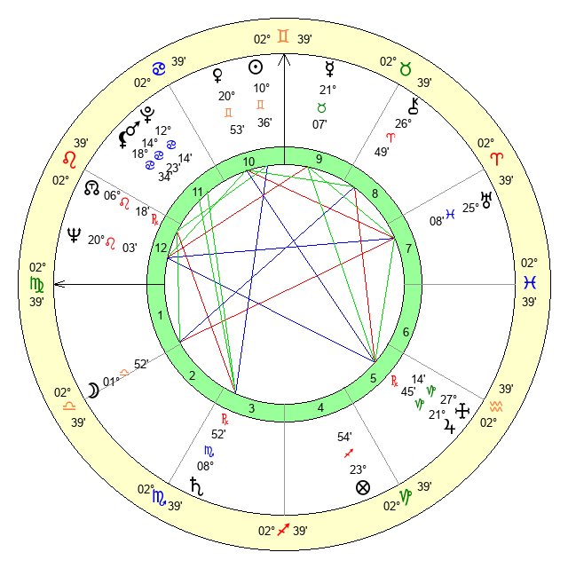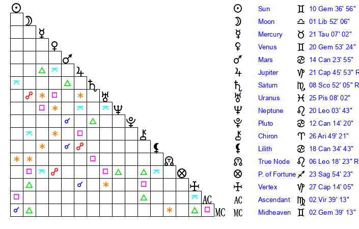 | Sun | 10 Gemini 37 | 11 Gemini 25 | 16 Virgo 26 |